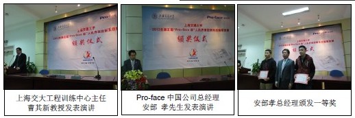 上海交通大学教务处、团委的领导、工程训练中心主任曹其新教授和吴书记以及Pro-face中国公司总经理安部孝先生出席颁奖典礼并做了精彩的演讲,在分别为获奖的学生颁奖之后,本届竞赛圆满的落下了帷幕。