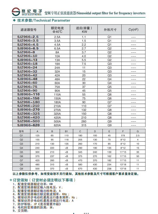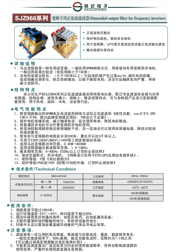 产品简介 正弦波滤波器是在PWM变频器驱动下,其开关频率范围在2 - 10KHz之间仍提供正弦波输出电压。在变频器驱动应用中,可以有效的抑制高频损耗及DV/DT射频干扰,改善电机的性能和寿命,并使电机和频器的线缆生长至500米,最长达3千米。 特点: 1、将变频器输出的SPWM电压电流波形转换为近似正弦波波形《线性负载,cos大于0.3时 THD小于5%;部分品牌变频器应用后,THD会大于此值》; 2、保护电机绝缘系统,减少轴承电流,延长使用寿命,降低电机噪音; 3、用普通异步电机可以代替变频异步电机使用; 4、有效地抑制高频损耗及射频辐射干扰,在一定场合可以使用非屏蔽电缆,降低对现场 布缆的要求; 5、使电机与变频器的电缆延长至500米,最长可以达3千米以上; 6、可用于220V\380V\690V\1140V等三相变频驱动系统; 7、适用马达变频器功率范围:0.4KW-1600KW 8、适用变频器输出载波频率范围:1.5-16KHz 9、基本频率范围:0-400Hz《50Hz以上订货的必须说明》 10、驱动负载形式:异步电机;《特殊设计后用于EPS\UPS及周边电源系统》; 11、耐热等级:F级《电抗器部分》 12、防护等级IP00或IP20《即配IP20的外箱,订货时必须说明》 应用: 1.将变频器输出的PMW波换成为正弦波 2.降低电机的涡流损耗以及电机噪声 3.减少输出电缆上和电机中的脉冲电流,延长电机寿命 4.可在变频器与电机间使用更长的电缆联线 5.减小对外的辐射,在一定场合可以使用非屏蔽电缆,降低了对现场布线的要求 6.有效防止DV/DT、过电压、电机过热和涡流损耗造成的电机提前损坏 技术规格: 1.工作电压:220VAC-1140VAC 2.工作电流:5A-1600A 3.工作频率:50/60Hz. 4.载波频率:2K-10K 5.绝缘等级:class F,H 6.压降:8%-12% 7.电压谐波畸变失真THD≤5% 8.空载电流≤8% 9.使用环境:-10…+45℃,额定值不会降低。最高可达+55℃,在45℃以上,每升高1℃,额定电流降低2% 10.防护等级:IP00-IP22 11.最大电流:1.5×额定电流,持续60S 12.噪 音:≤65dB 13.温 升:≤80K 14.抗电强度:铁芯-绕组 3000VAC/50Hz/5mA/10s无飞弧击穿(工厂测试) 15.绝缘电阻:1000VDC绝缘阻值≥100MΩ 16.海拔高度不超过2000米 17.运行环境温度-25℃~+45℃,相对湿度不超过90%。 18.周围无有害气体,无易燃易爆物品。 19.周围环境应有良好的通风条件,如装在柜内,应加装通风设备。 执行标准: IEC289:1987电抗器 GB10229-88电抗器(eqvIEC289:1987) JB9644-1999半导体电气传动用电抗器 产品尺寸:可根据用户要求定制。