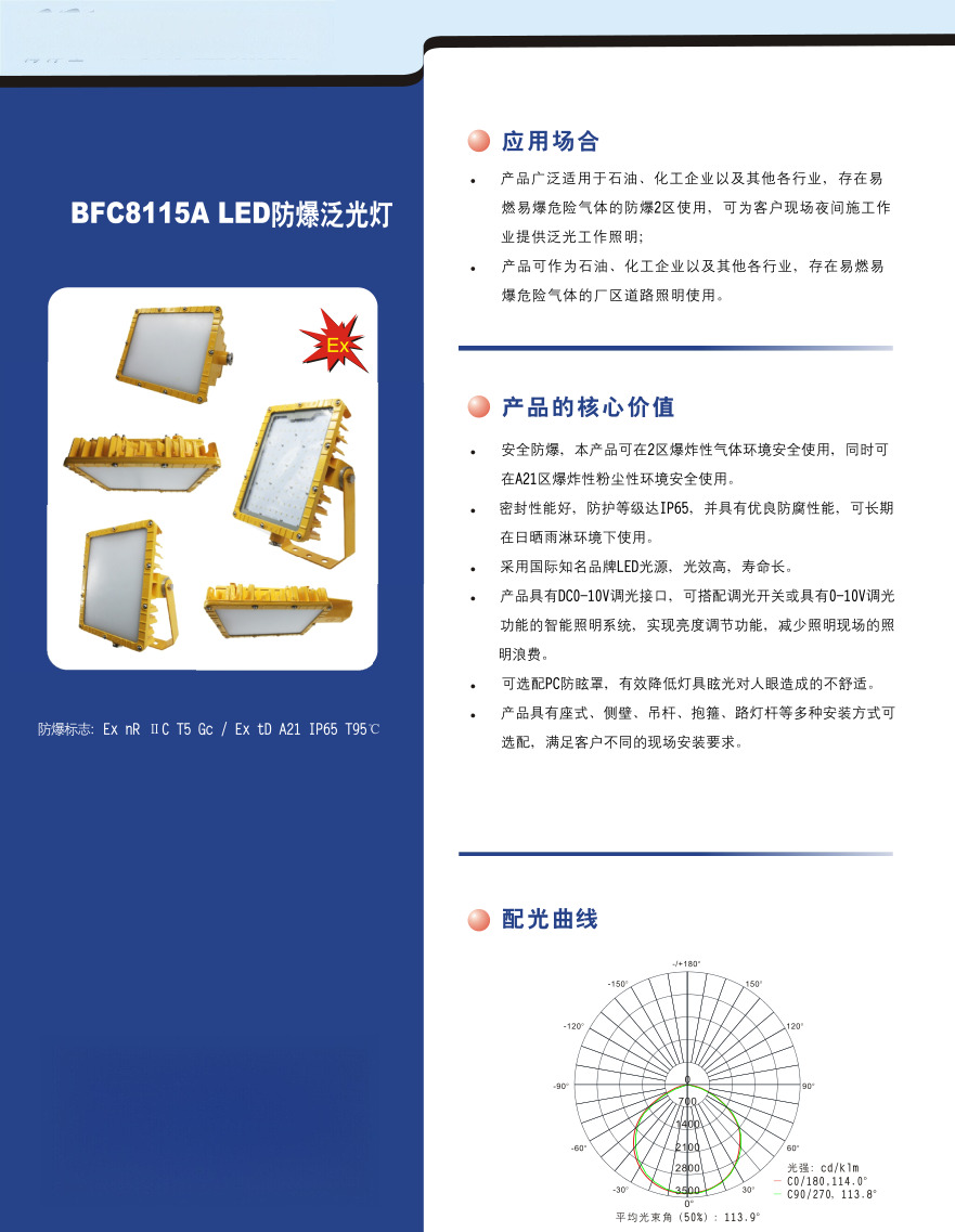 BFC8115 LED防爆投光灯 适用场所: 适用于石油、化工等行业易燃易爆场所的泵房、装置区域、油站、气站、联合站等室内外泛光照明。