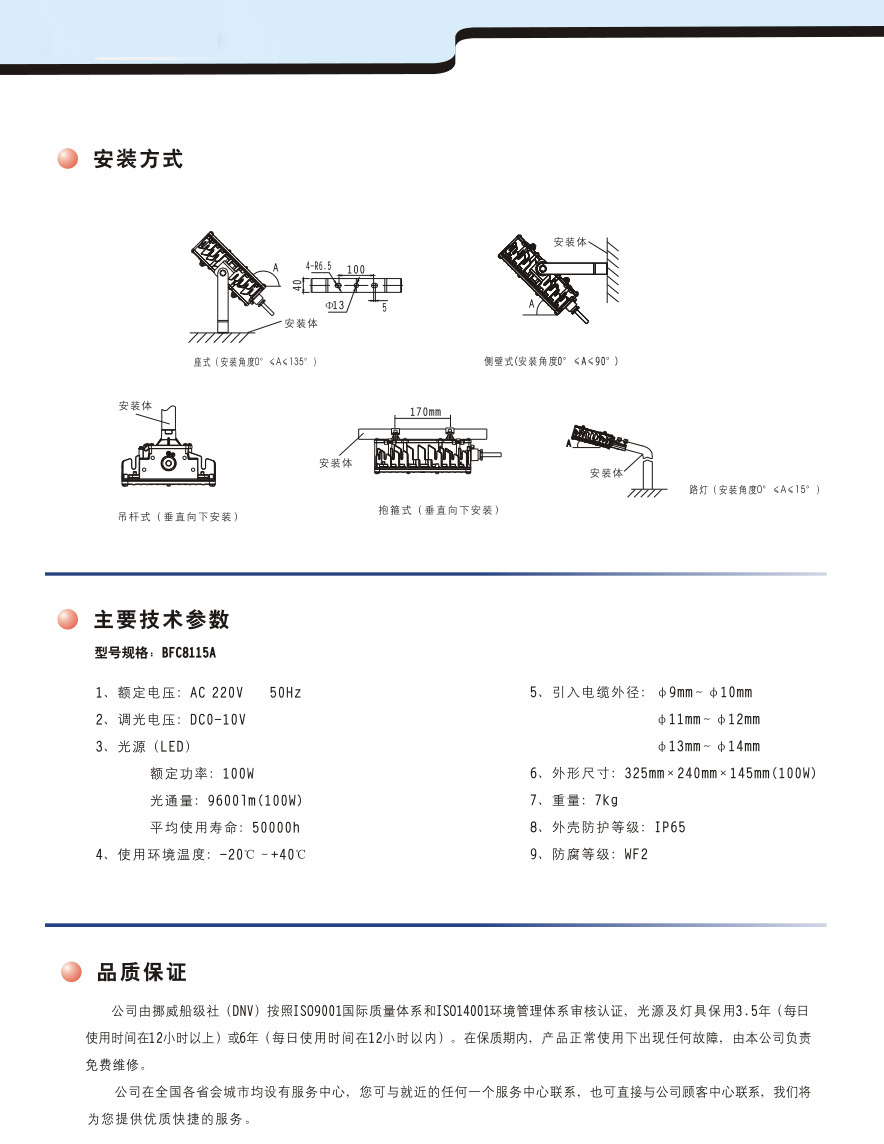 二、结构特性: 1.优良的防爆结构设计,可在各种易燃易爆场所安全使用。 2.LED光源,光效高,寿命长,抗震性强,体积小。 3.合理的配光设计,照射、角度广、亮度高、照射均匀。 4.从结构设计上满足防水要求,产品外壳防护等级达到IP65。 5.灯具外壳采用特殊合金材料,结合高科技喷涂工艺,性好,各种室内外环境可靠使用。 6.光源腔与驱动腔分腔设计,同时光源腔也为分腔设计、散热鳍阶梯化设计,不仅有效控制各部件的温升,还能避免热岛效应(即防止局部过热),从而延长LED和驱动的使用寿命。 7.配备U型支架,可实现座式、侧壁式、吸顶式多种安装方式。