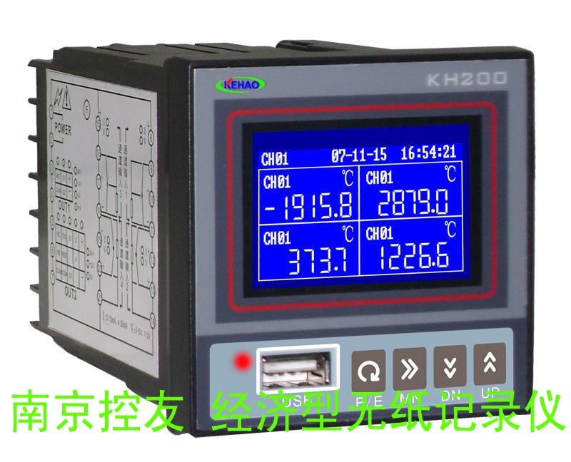 KH200B小型蓝屏无纸记录仪(72×72mm最多4通道输入,160×80mm最多16通道输入),为蓝屏液晶显示。仪表具有万能输入功能,集热电偶信号、热电阻信号、标准电压、标准电流信号于一体。可提供报警、馈电、打印、通讯等功能。仪表具有强大的显示功能,高精度棒图显示、实时曲线显示、历史曲线追忆、报警状态显示,同时可直接查询年、月、日、时、分、秒的数据,快捷方便。使用RS232/485通讯,可与组态王、MCGS等专业软件进行组态。数据可直接通过任意U盘导出,U盘既插既读,无需任何操作;分析软件可导出EXCEL数据格式或曲线格式,直接打印既可。