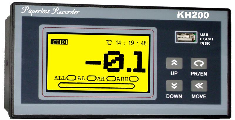 KH200R经济型无纸记录仪(160×80mm最多16通道输入),为黄色屏液晶显示。仪表具有万能输入功能,集热电偶信号、热电阻信号、标准电压、标准电流信号于一体。可提供报警、馈电、打印、通讯等功能。仪表具有强大的显示功能,高精度棒图显示、实时曲线显示、历史曲线追忆、报警状态显示,同时可直接查询年、月、日、时、分、秒的数据,快捷方便。使用RS232/485通讯,可与组态王、MCGS等专业软件进行组态。数据可直接通过任意U盘导出,U盘既插既读,无需任何操作;分析软件可导出EXCELL数据格式或曲线格式,直接打印既可。