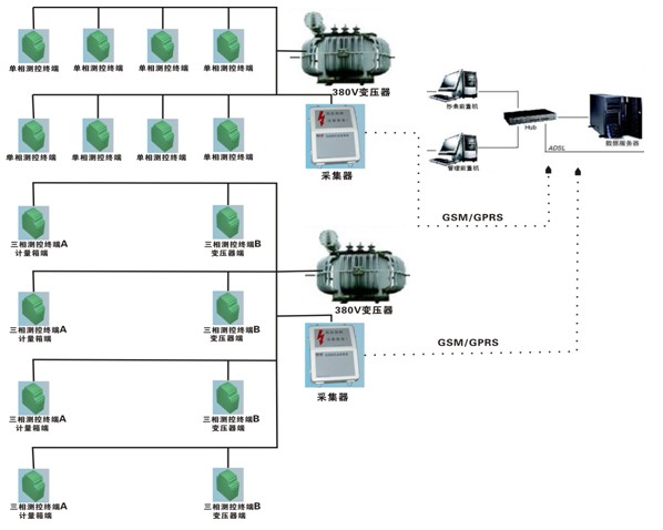 数据采集集器单元: 安装在变压器240/415V的低压端。数据采集器单元和主站之间的通信可以通过GSM、GPRS、CDMA实现,而采集器和测控终端之间的通信则是通过低压电力线载波、有线RS485或无线组成的混合通讯技术实现。
