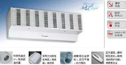 风幕机又称空气幕、风帘机、风闸、空气门,英文名称:air curtainsair doorair curtain,风幕机产品广泛应用于工厂、商店、餐厅、药店、冷库、宾馆、医院、机场、车站等环境的出入口上及一切装有空调器的场所,应用特制的高转速电机,带动贯流式、离心式或轴流式风轮运转产生一道强大的气流屏障,能有效的保持室内空气清洁,阻止冷热空气对流,减少空调能耗,防止灰尘、昆虫,及有害气体的侵入,提供一个舒适的工作、购物、休闲环境