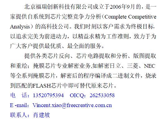 提供各类芯片反向、芯片电路提取和分析、版图提取和重绘、FPGA替代芯片解决方案设计;掩膜芯片专业解密业务,如解密日立、三菱、NEC等全系列掩膜芯片(解密后的程序编译成二进制文件,烧录到匹配的FLASH芯片中即可替代原来芯片)有需要的联系。OICQ:262533058  电话:13520795394