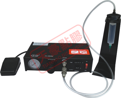 TH-2004KE型 天豪数码循环点胶机             技术参数: 出胶时间: 0.007S-9.999S 循环(间断)时间: 0.1S-9.9S 输入气压: 1bar–7bar 输出气压: 0.1bar–7bar 重复精度: 0.0005S 最小滴点量: 0.005ml 工作速度: > 600次/分 输入电压: 110V/220V±10% 50Hz 消耗功率: < 15W 重 量: < 4Kg 尺 寸: 70×210×256mm   特点: 1.本机适合点滴量精度要求较高的产品或产品大批量生产 2.机器设有自动循环功能有效减轻劳动强度,提高产量 3.采用数字电路定时定量控制技术,数码拨盘设定出胶时间 4.配备真空回吸装置以消除液体滴漏 5.脚踏开关/指环开关/感应开关可供选择