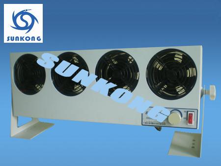 SUNKONG™  SG-8004B四头台式离子风机由四台小风机提供风力,风力大小可由调速开关在一个很大的范围内进行调节。风机可产生大量的带有正负电荷的气流,可以将物体上所带的电荷中和掉。当物体表面所带为负电荷时,它会吸引气流中的正电荷,当物体表面所带为正电荷时,它会吸引气流中的负电荷,从而使物体表面上的静电被中和,达到消除静电的目的。(机身长度可按要求定制)