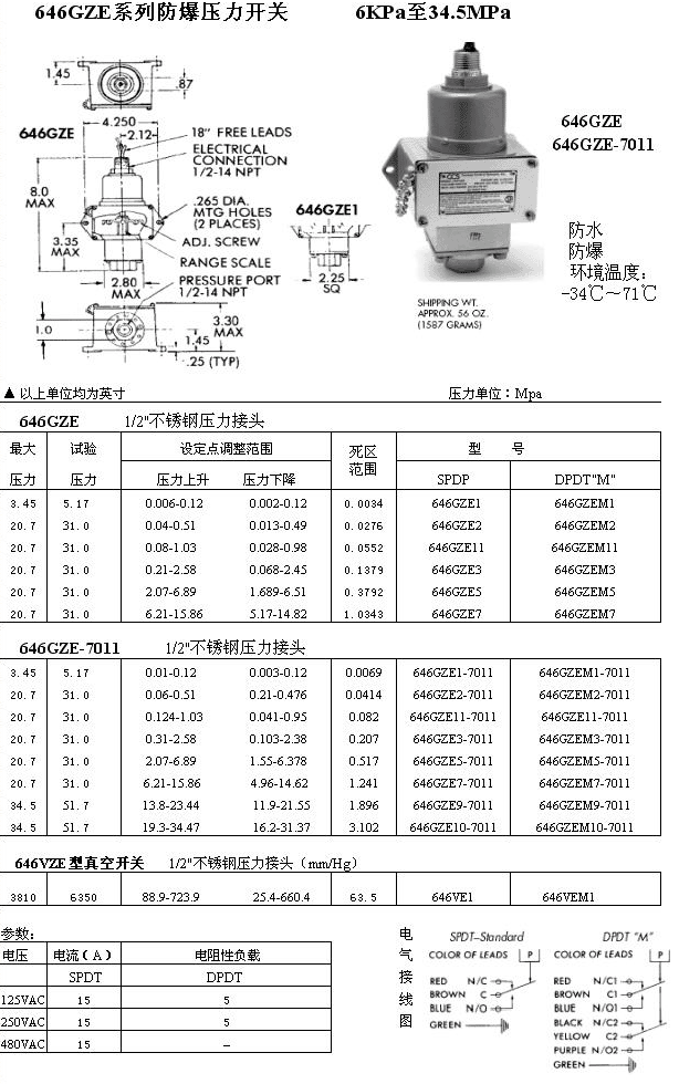 7.电气触点的容量: 从原文说明书中给出的交流参数可知,压力开关中电气触点容量是很大的. 但是由于技术标准等方面的原因,关于直流参数,美国公司仅给出最大为125VDC的指标,对于其他情况,用户可根据国内普遍的设计原则,按容量判断原则来应用.