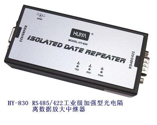 HY-830 RS485/422工业级加强型光电隔离数据放大中继器(内置式) 1.接口特性:接口兼容EIA/TIA的RS232.RS485/422标准 2.电气接口:RS485/422输入端DB9母头连接器,RS485/422输出端DB9公头连接器,配接线柱,支持128节点,+/-15KV防静电 3.保护等级:RS485.RS422接口每线600W的雷击浪涌保护 4.隔离度:隔离电压2500Vrms 500DC连续,电源全隔离 5.工作方式:异步半双工,全双工差分传输自动选择,无需跳线设置 6.传输介质:双绞线或屏蔽线 7.传输速率:300BPS-115.2KBPS 8.外形尺寸:113mm×55mm×25mm 9.使用环境:-40℃到85℃,相对温度为5%到95% 10.传输距离:0-5000米(RS485/422端) )(115200BPS-9600BPS) 11.信号指示:三个信号指示灯电源(PWR)发送(TXD)接收(RXD)