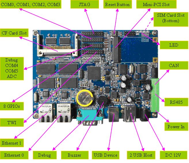 - MiniPCI接口集成SDIO、SPI、UART、USB,可扩展3G模块、GPS模块、GPRS/GSM模块、WiFi/BT模块