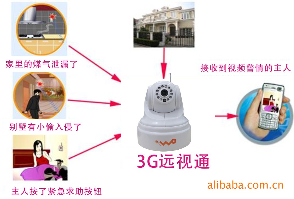 二、 当家中发生燃气泄露、盗贼入侵、老人突发疾病时,家中防盗报警等探测配件可以立即将警情信息通过“远视通”报告给主人3G手机,可以马上看到家中实时视频监控画面。