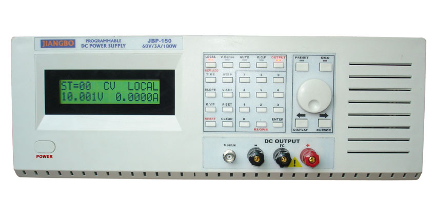 精密型可编程线性直流电源供应器是上海江柏电子科技有限公司专业生产的测试仪器    概述: JBP系列是一款真正完美的高精密线性直流电源. 可超低电压输出,满足半导体产品所需的低电压工作要求.电压上升斜率设置 (SLOPE)功能,以及AUTO SEQUENCE功能可满足电机产品及各电子产品老化实验所需。     特点 . 高稳定,极低杂讯,低漂移线性结构. 面板功能操作简易恒电压、电流按键式设置输出. 大型2 X 16LCD 4 1/2位显示. 电压缓升时间SLOPE功能设置,电压可模拟梯度自动连续输出. 快速响应,时间100us以内  过电压、过电流、过温度保护功能. 低压补偿V-SENSE功能 . 100组面板记忆存储功能设置•可利用旋钮对电压和电流进行调节 •可利用光标调节数字步进值 •可定时输出时间(1mS~50000秒)•可选GPIB/RS232通讯接口 (详情参见www.shjiangbo.cn),本公司欢迎各位加盟代理销售.