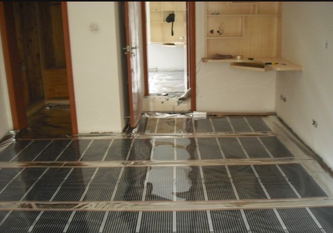 电热膜表层材料为特制的聚酯薄膜,膜片中间的墨线是采用特制可导电油墨,是电热膜核心部分,相当于很多并联的电阻,通电后可发热。电热膜两边的银色条是金属载流条,是用来连接油墨(电阻),作用相当于导线。金属载流条的主要材料为铜镀锡和银浆。电热膜智能供暖系统采用先进的电脑数控技术制造,能精确控制膜片上固化油墨的厚度,保证膜面温度均匀稳定。 低温辐射电热膜是一种通电后能发热的半透明聚酯薄膜,由可导电的特制油墨、金属载流条经加工、热压在绝缘聚酯薄膜间制成。工作时以电热膜为发热体,将热量以辐射的形式送入空间,使人体和物体首先得到温暖,其综合效果优于传统的对流供暖方式。低温辐射电热膜系统由电源、温控器、连接件、绝缘层、电热膜及饰面层构成。电源经导线连通电热膜,将电能转化为热能。由于电热膜为纯电阻电路,故其转换效率高,除一小部分损失(2%),绝大部分(98%)被转化成热能. 电热膜系统组成及功能: (1)电热膜系统包括以下几个部分: 1、保温层 2、反射膜 3、电热膜;4、连接导线、连接卡、绝缘罩 5、温控器。 (2)电热膜片 电热膜片是整个系统的核心元件,是此系统的发热元件。它的基材为PET特制聚酯膜,发热体为特制导电油墨、附以银浆和导电的金属汇流条为导电引线,最后经热压下复合而成。电热膜的发热主要以辐射的方式散发热量,属低温辐射,它具有透射性,以红外线的形式向室内散发传递热能。 (3)连接导线、连接卡、绝缘罩 连接导线是对电热膜提供电源,对整个电路构成回路,连接卡、绝缘罩是为了跟电热膜的组成部分 ,保证运行安全。 (4)温控器 对整个电热膜系统进行控制,保证室内温度的稳定性。 电热膜连接方法: 电热膜通过连接卡与温控器连接,每组膜以并联方式连接,最后统一由一组线路串联到温控器,所有接头均密封于连接卡中,导线部分不能出现接头点. 附,连接卡安装方法: ▼连接卡安装在电热膜组的一个末端(另一末端用特制绝缘胶带作绝缘处理)。 ▼将连接卡的中心对准并盖住载流条的一端。用专用工具的压力将其压紧在适当的位置。 ▼用专用压接钳将连接卡压紧、压平到电热膜上,并用M3胶作防水绝缘处理。