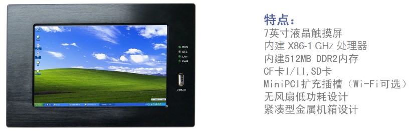 该工业平板电脑采用7英寸液晶触摸屏/内建X86-1 GHz处理器/CF1/11SD/MiniPCI扩充插槽(Wi-Fi可选)/无风扇低功耗设计/紧凑型金属机箱设计
