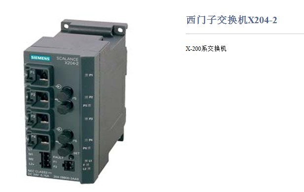 型号:SCALANCE X204-2,网管型交换机,带有4 个10/100Mbit/s RJ45接口,2个100Mbit/s 多模光纤接口,LED诊断功能,故障信号显示,连接设置按钮,冗余电源输入,PROFINET IO设计,网络管理,可组成冗余环,可选C-PLUG,电子手册光盘。