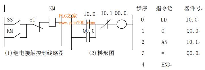 梯形图的设计应注意到以下三点: ①梯形图按从左到右、自上而下地顺序排列。每一逻辑行(或称梯级)起始于左母线,然后是触点的串、并联接,最后是线圈。 ②梯形图中每个梯级流过的不是物理电流,而是“概念电流”,从左流向右,其两端没有电源。这个“概念电流”只是用来形象地描述用户程序执行中应满足线圈接通的条件。 ③输入寄存器用于接收外部输入信号,而不能由PLC内部其它继电器的触点来驱动。因此,梯形图中只出现输入寄存器的触点,而不出现其线圈。输出寄存器则输出程序执行结果给外部输出设备,当梯形图中的输出寄存器线圈得电时,就有信号输出,但不是直接驱动输出设备,而要通过输出接口的继电器、晶体管或晶闸管才能实现。输出寄存器的触点也可供内部编程使用。 2)指令语句表 指令语句表是一种用指令助记符来编制PLC程序的语言,它类似于计算机的汇编语言,但比汇编语言易懂易学,若干条指令组成的程序就是指令语句表。一条指令语句是由步序、指令语和作用器件编号三部分组成。 下例为PLC实现三相鼠笼电动机起/停控制的两种编程语言的表示方法: