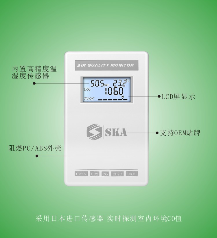 实时监测室内空气质量并报警 监测 CO ( 多种可挥发性 气体) 监测并显示温度和湿度 三色背光 LCD 显示及蜂鸣报警 提供 1 路开关量输出控制通风设备 墙面安装型和桌面安装型 性能优良,操作简便 特点: 1、为实时监测室内空气质量而设计 2、内置 电化学CO传感器具有自校验功能,使得 CO 测量更精确更可靠 3、CO 传感器使用寿命超5 年 5、数字集成温湿度传感器使用寿命超过 10 年 6、三色(绿/黄/红) 背光 LCD 屏显示室内空气质量状态:良好/欠佳 7、两种报警方式:蜂鸣器报警和背光灯颜色变换报警 8、提供 1 路继电器输出用于控制一个通风设备(可选) 9、轻触键易于操作 10、性能优良,适用于家居或办公环境的空气质量监测和控制 11、100~240VAC, 24VAC/VDC 电源可选; 电源适配器可选; 桌面安装型和墙面安装型可选 12、EU 标准及 CE 认证