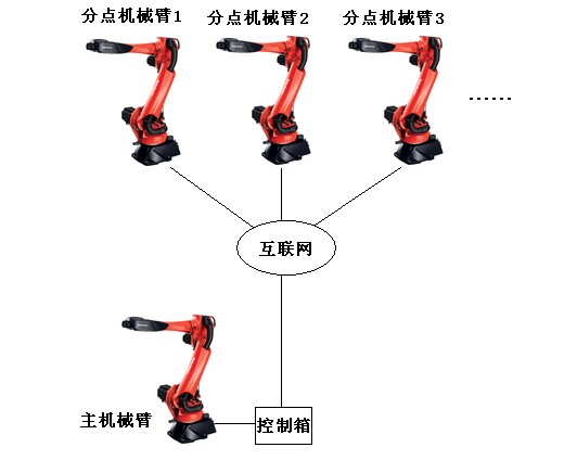 一台主控机械手臂(机器人、机械手掌、直线滑台等)的实时动作,可通过有线网络、无线WIFI、串口、485以及互联网云等通信技术,远程传输到各分点的机械手臂,然后控制所有分点的机械手臂与主控机械手臂进行同步动作,即主控机械手臂的一举一动都会通过通讯网络实时传输到各分点(机器人),然后各分点机械臂即能实时做出与远程主控机械手臂完全一模一样的动作。