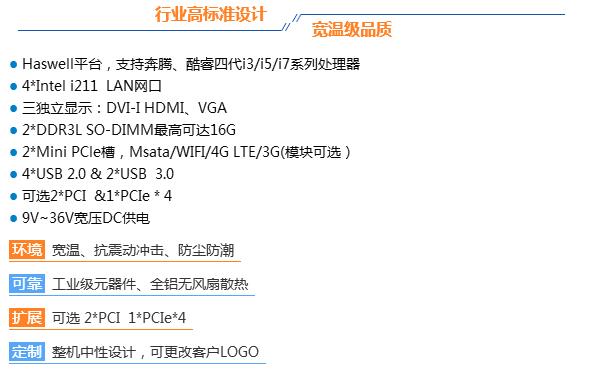 集智达高可靠无风扇嵌入式工控机MMAC-6849,板载支持Haswell平台 支持奔腾、酷睿、四代i3、i5、i7系列处理器。