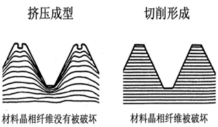 挤压丝锥是一种先进的高效内螺纹加工工具,与切削丝锥相比,具有以下特点:一是加工螺纹时不产生切屑,螺纹表面光滑,加工尺寸易保证;二是由于螺纹是挤压成形的,金属纤维不断裂,并在表面形成一层冷硬层,可提高螺纹的强度和耐磨性;
